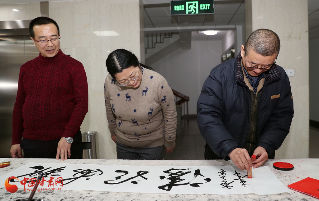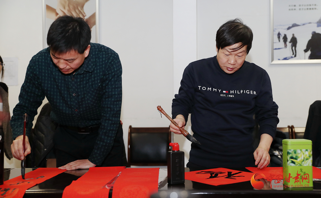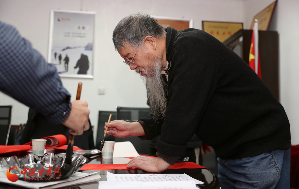 中國甘肅網(wǎng)1月19日訊(本網(wǎng)記者 宋芳科 任磊 文/圖)爆竹聲聲辭舊歲,又是一年新桃換舊符的時(shí)刻,怎么能少得了喜氣洋洋的春聯(lián)。1月19日,在西北師范大學(xué)美術(shù)學(xué)院教授、蘭州市安寧區(qū)美協(xié)副主席包建新,金城文化名家、蘭州市美協(xié)駐會(huì)副主席王安民領(lǐng)銜主筆下,蘭州市多位書畫家走進(jìn)中國甘肅網(wǎng),揮毫潑墨寫春聯(lián),為網(wǎng)站帶來了濃濃的年味。據(jù)悉,這也是蘭州書畫家新春文化送基層的系列活動(dòng)之一。