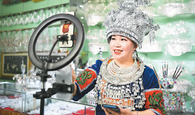 受疫情影響,貴州省黔東南苗族侗族自治州榕江縣古州鎮(zhèn)老街的傳統(tǒng)民族文化商鋪商品銷售受挫。近來,當地有關部門引導商家在線下有序開業(yè),并通過網上直播等線上方式進行銷售。“線上線下”齊開工,傳統(tǒng)民族文化商品銷售出現(xiàn)新生機。王炳真攝(人民視覺)