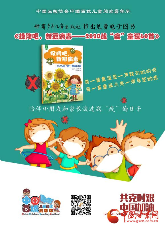 庚子之春,新冠肺炎疫情爆發(fā),全國人民奮力投身到這場疫情防控阻擊戰(zhàn)中,孩子們、兒童文學(xué)作家也紛紛創(chuàng)作了大量優(yōu)秀的童謠。2月份,讀者出版集團(tuán)旗下甘肅少年兒童出版社(以下簡稱:甘肅少兒社)積極聯(lián)合“葫蘆文產(chǎn)”,策劃上線了免費(fèi)數(shù)字出版物《投降吧,新冠病毒——2020戰(zhàn)“疫”童謠60首》。書中收錄60首優(yōu)秀童謠作品,對兒童進(jìn)行防疫科普宣傳,以期提高兒童科學(xué)防護(hù)意識和戰(zhàn)勝病毒的信心。一首首童謠匯集起來,架起了孩子和家長共同抗疫的橋梁,也點亮了孩子們用稚嫩的眼光和思維認(rèn)識這場災(zāi)難的微光。