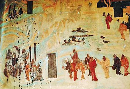 出土的高臺(tái)地埂坡胡人墓、西安安伽墓、史君墓、青海郭里木吐蕃墓棺板畫中都有關(guān)于商隊(duì)運(yùn)營的場(chǎng)面,敦煌莫高窟壁畫、唐三彩中的胡商俑等,都為我們提供了生動(dòng)的圖像資料。