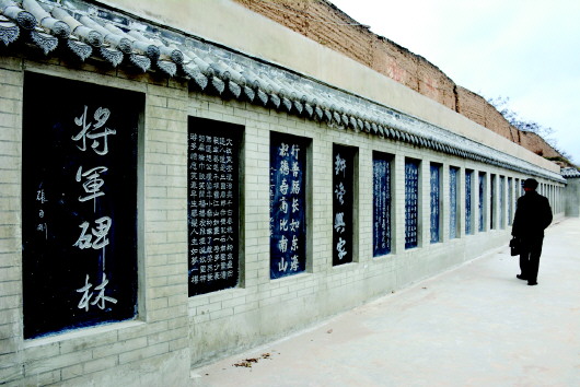 中岔古堡一堡三院,分為前院、中院、后院。走進(jìn)古堡,堡門左側(cè)建有戲樓,上書“中岔劇場”四字。戲樓(又稱戲臺(tái))始建于清光緒年間,上世紀(jì)六七十年代曾重修過。近堡門處右側(cè)堡墻下修建有兩處一體化的石碑長廊一直通向后院,碑廊中石碑一塊接著一塊砌筑在青磚墻內(nèi),石碑與石碑之間以青磚分隔,上覆筒瓦和滴水防護(hù),每一通石碑上都刻有中華人民共和國將軍書寫的一幅書法作品。第一通石碑上甘谷籍將軍張臣剛書寫的“將軍碑林”四字分外醒目,劉精松、邢世忠、裴懷亮、李乾元等數(shù)十位叱咤風(fēng)云的共和國將軍書寫的書法碑刻依次嵌進(jìn)墻內(nèi),組成一個(gè)氣勢磅礴、雄偉壯觀的將軍書法長廊,這就是新建的將軍碑林。