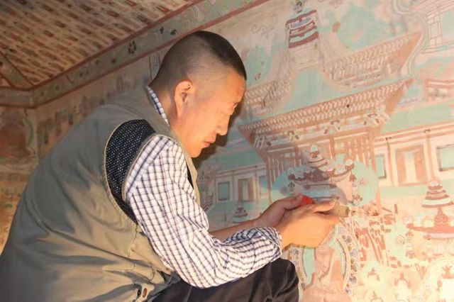 1990年,李云鶴的兒子李波同樣成為了敦煌研究院的文物修復(fù)師。對(duì)于生于敦煌、長(zhǎng)于敦煌的李波而言,回到敦煌修壁畫是一件再自然不過(guò)的事情,“家里有一位修壁畫的父親,這對(duì)我的影響是極大的。而且這里是我的故鄉(xiāng),我對(duì)敦煌對(duì)莫高窟,有感情也有責(zé)任。”