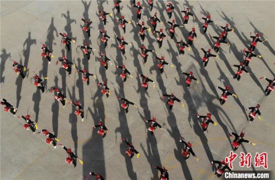 圖為甘肅武威市涼州區(qū)四壩鎮(zhèn)九年制學(xué)校的學(xué)生練習(xí)攻鼓子?!钇G敏 攝