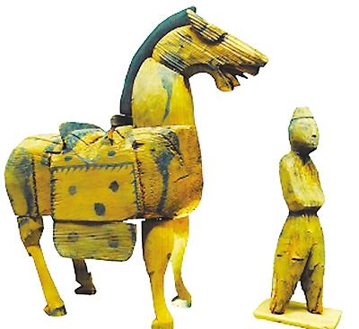 張掖高臺(tái)縣駱駝城遺址出土的胡俑牽馬木雕