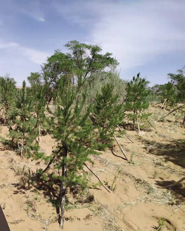 我和同伴撲進(jìn)沙海柔軟的懷抱。認(rèn)識(shí)到,再小的沙粒,也不能與塵世隔絕,我與沙,結(jié)緣于此。沙海里,一沙一世界。黃沙大膽赤裸地暴露在天幕蒼芎下,以大,以小,涵納無(wú)窮。“沙沙”的足音里,印下我深深淺淺兩行腳印,宣告著浪漫與踏實(shí)的存在。我來(lái)到習(xí)近平總書(shū)記親手栽植的“五棵松”下,仰視青松,綠云葳蕤,生機(jī)勃勃??倳?shū)記的關(guān)懷和鼓勵(lì),黃沙熱熱地、輕輕地長(zhǎng)出了更多綠色羽翼,這羽翼在不斷地生長(zhǎng)壯大,有“代代相傳”的精神,綠色終究會(huì)覆蓋全部騰格里。捧起一捧黃沙,細(xì)沙像嬰兒肌膚般的柔滑,我試圖用臉貼近它,這些黃色的小精靈,從我指縫間輕盈地流淌到松下,似乎在暗示我,要把自己的夢(mèng)筑進(jìn)治沙精神的瀚海里??茖W(xué)家們已作出結(jié)論:沙漠是人類最后的寶地,別看它現(xiàn)在荒蕪,它里面蘊(yùn)藏著無(wú)盡的寶藏和財(cái)富。