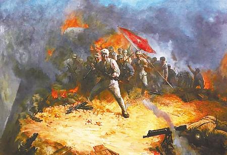 我聽見槍聲,立即帶領一排的十個同志,趁敵人只顧朝橋下射擊的機會,沖到橋邊。先向敵人扔過去一排手榴彈,接著沖進了敵人筑在橋頭上的立射工事。敵人根本沒提防這一手,頓時慌了手腳,亂作一團。我們殺向橋頭。橋下的同志也從巖石下鉆了出來。他們不顧橋上敵人的射擊,翻上橋面,拔出大刀,喊著沖殺聲跟敵人肉搏起來。橋窄人多,我們的大刀在短兵相接中,大大發(fā)揮了作用。一排長掄起大刀揮向敵群。突然,他被一顆流彈擊中了。他踉蹌了一下,又站定腳跟,大聲呼叫:“同志們沖呀!敵人已經支持不住了!”正當我們拼殺得非常激烈的時候,突然從敵人后山上,升起了一顆白色信號彈。這是一、二連迂回成功的信號。接著,又有三顆紅色信號彈從我們的背后升起來。這是發(fā)起總攻的信號。四顆信號彈還沒有熄滅,沖鋒號、輕重機槍、迫擊炮和吶喊聲,從四面八方一齊響了起來。被我們殺得暈頭轉向的敵人聽到陣地后面也打起來,周圍的槍炮又連天響,以為被紅軍四面包圍,摔下槍支就倉惶逃命了。