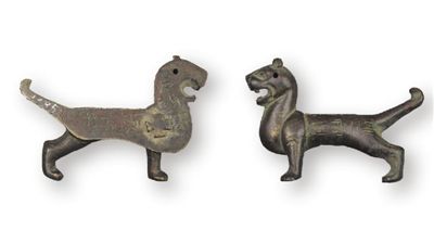 銅虎符(圖③)高4.7厘米、長6.9厘米。虎圓豎耳,怒目張口,挺胸昂首,尾上翹,作奔走狀。符頭部有圓穿孔,背面有凸起的十字扣。符身正面陰刻篆書“永安府”字樣,背面陰刻楷書“右翊衛(wèi)”“右驍衛(wèi)”“永安四”“蘭豐二”等字樣。右翊衛(wèi)、右驍衛(wèi),官署名,為隋唐十六衛(wèi)中的兩衛(wèi)。隋初稱左右衛(wèi),隋煬帝時(shí)改為左右翊衛(wèi),所領(lǐng)軍士稱驍騎。館藏虎符出土于甘肅莊浪,是隋代府兵駐防莊浪的歷史見證,是研究隋代府兵制度的重要實(shí)物資料。