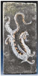 這件高臺(tái)縣博物館館藏的漢晉彩繪虎畫像磚,長42.5厘米,寬20厘米,厚6.5厘米,出土于駱駝城苦水口1號(hào)墓葬,屬國家二級(jí)文物。作為“四神”形象之一,多見于墓葬中磚砌門飾構(gòu)件之上。