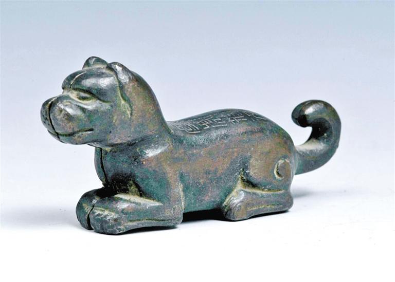 這件山丹縣博物館館藏的銅鑄虎符通長9.5厘米,兩半相合在一起,呈臥虎式,合符內(nèi)側(cè)有三個(gè)卯榫符合?;⒎懳那逦?,造型優(yōu)美?;⒈巢績砂胗绣e(cuò)銀篆書銘文:“與長社太守”“為虎符左二”。其為國家二級(jí)文物。這件虎符虎目平視面容溫和,伏臥姿態(tài)和上翹的虎尾顯得俏皮又生動(dòng)。與威風(fēng)凜凜或者勁瘦有力的虎符不同,圓圓的虎頭、圓潤的四肢與后臀,增添了幾分憨厚可愛。