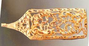 受草原文化影響,虎的造型更具藝術(shù)性,形式亦豐富多彩。甘肅省博物館藏的西周虎紋耳形銅鉞,整體似半環(huán),鑄猛虎紋,虎背為刃。尾下有短胡兩穿,尾、雙爪上鑄凹槽,虎首下彎,張口含銎,露牙睜目,領(lǐng)內(nèi)有一圓形穿孔。甘肅省文物考古研究所藏的戰(zhàn)國金帶鉤,鉤首為長頸龍首狀,頸部為三棱狀,肩部三角形邊框內(nèi)鏤空雕鑄對稱和狼形圖案。鉤身為長方形,邊框內(nèi)鏤空雕刻一組正反相對稱的虎噬大角羊圖案。張家川回族自治縣博物館藏的戰(zhàn)國晚期的虎形金飾片,虎尖耳上翹,大嘴張開,鬃毛卷曲上翹,尾前卷于背部與鬃毛相連,四足著地做行走狀,栩栩如生地展現(xiàn)了虎行走的動感之態(tài)。甘肅省博物館藏的戰(zhàn)國虎噬羊紋金飾片,虎張口露齒,垂首蹲踞,虎口銜羊,前爪按住羊肩部,后爪抓住羊臀部,羊四肢跪地作掙扎狀,活靈活現(xiàn)地展現(xiàn)出猛虎捕食羊的瞬間動態(tài),形象逼真。這些虎文物都是此次展覽中的亮點。