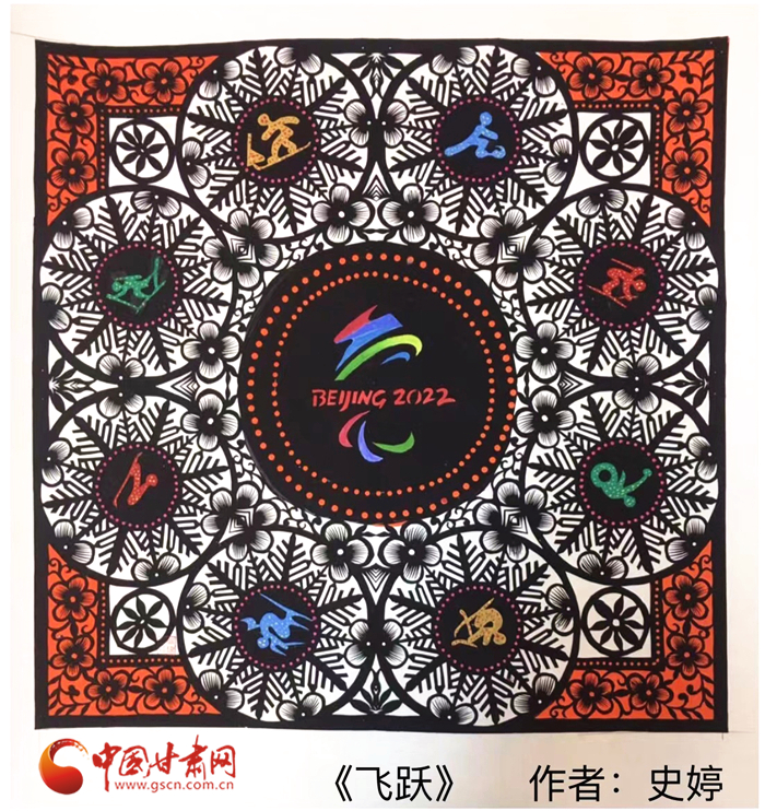 “剪紙是中國傳統(tǒng)文化,也是我的特長,所以我就用剪紙的形式創(chuàng)作了這兩幅《冬夢》《飛躍》”。時(shí)值冬奧會(huì)在北京盛大開幕,史婷以冬奧會(huì)和冬殘奧會(huì)的會(huì)微為主題,加上一些比賽項(xiàng)目的標(biāo)志,創(chuàng)作了兩幅剪紙藝術(shù)作品。“我想通過作品為奧運(yùn)健兒們加油助力,希望他們?cè)诒荣愔心苋〉酶玫某煽儭?rdquo;她說。