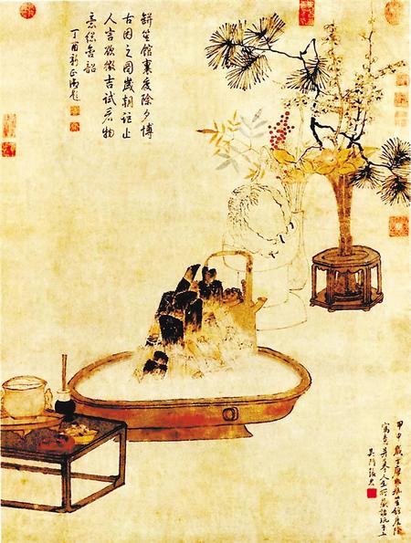 明代陶成的一幅《歲朝圖》,除時花吉物外,一半的筆墨給了和酒有關的物件,飲酒的青銅爵、溫酒的榾柮爐(燃木塊的火盆)、盛酒的罌瓶。同時,畫中出現(xiàn)的器物皆以相應的青銅器皿替代。對古物的熱情和對獨酌的偏愛,都暗示著畫家文人墨客的身份。