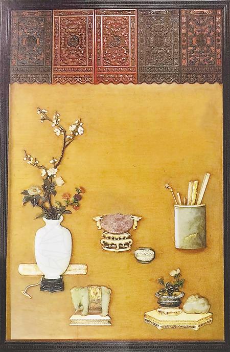 百寶嵌歲朝吉祥御制題詩掛屏,使用各種瓷、玉、寶石、金銀材料鑲嵌而成,也只有皇家才能制作。其中各部分零星擺放,相互之間無甚關聯(lián),已經(jīng)出現(xiàn)歲朝圖圖案化的苗頭。在后來的發(fā)展中,歲朝清供圖演變成裝飾圖案,出現(xiàn)在服飾、建筑等藝術(shù)中。
