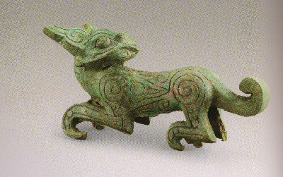 禮縣大堡子山祭祀樂器坑出土,共三只,造型相同,大小相似,為全國虎伴樂器出土的首例。其形象回首卷尾、聳耳曲爪、憨態(tài)可掬,極具觀賞性,是春秋時期虎造型的杰作,體現(xiàn)了秦國早期高超的造型能力和精湛的鑄造技術(shù)?;⒌男蜗笤诖呵锴厝说钠魑镏卸嘁?,不但有自成個體的金虎、青銅回首虎,同時虎作為附飾也出現(xiàn)在一些大的青銅器上。