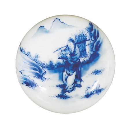 一件是青花印泥盒,制作于20世紀(jì)初。直徑7厘米,高3厘米,盒身扁圓,鼓腹,上下相合。盒蓋用青花繪“樵夫讀書”圖。畫面遠(yuǎn)處,兩座山峰高聳云間,四周樹木蔥蘢,山石嶙峋。畫面正中的山路上,一樵夫砍柴歸來,身背一大捆柴草,他右手扶著木棍,左手則捧著一本書,雙眼盯著書本,緊抿嘴唇,正津津有味地邊走邊讀。讀到精彩處,露出會(huì)心一笑。看來,這個(gè)樵夫是極愛讀書的,這種好學(xué)精神,難道不值得我們學(xué)習(xí)嗎?這件瓷印泥盒,青花色澤典雅,人物衣褶神態(tài)描繪細(xì)致,栩栩如生,胎體堅(jiān)致,白釉溫潤,層次清晰,保存完好。