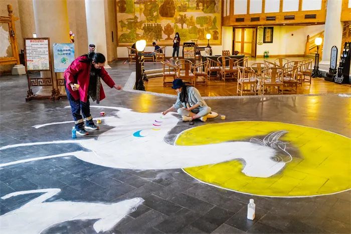 5月8日,母親節(jié),酒泉敦煌市沙文化館以敦煌莫高窟九色鹿壁畫(huà)為摹本,以彩色沙為原料,5人團(tuán)隊(duì)通力合作,在敦煌鳴沙山下的敦煌山莊大堂“繪制”出長(zhǎng)10米寬6米的大型九色鹿沙畫(huà),同時(shí)“繪制”了一幅“三兔藻井”沙畫(huà)圖案,寓意天下母親“福祿安康”“一路平安”,祝天下母親節(jié)日快樂(lè)。