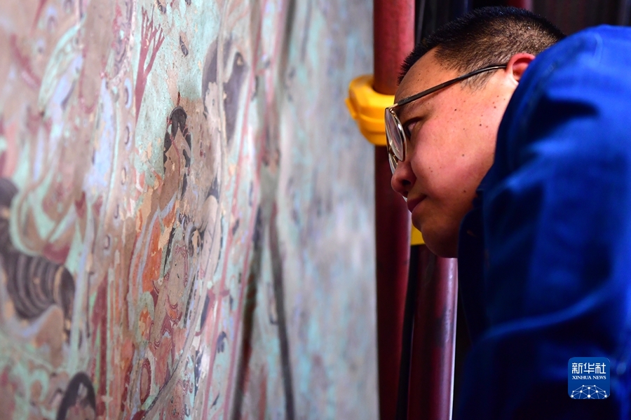 4月19日,在莫高窟第231窟,楊金禮在修復(fù)出現(xiàn)病害的壁畫。新華社記者 杜哲宇 攝