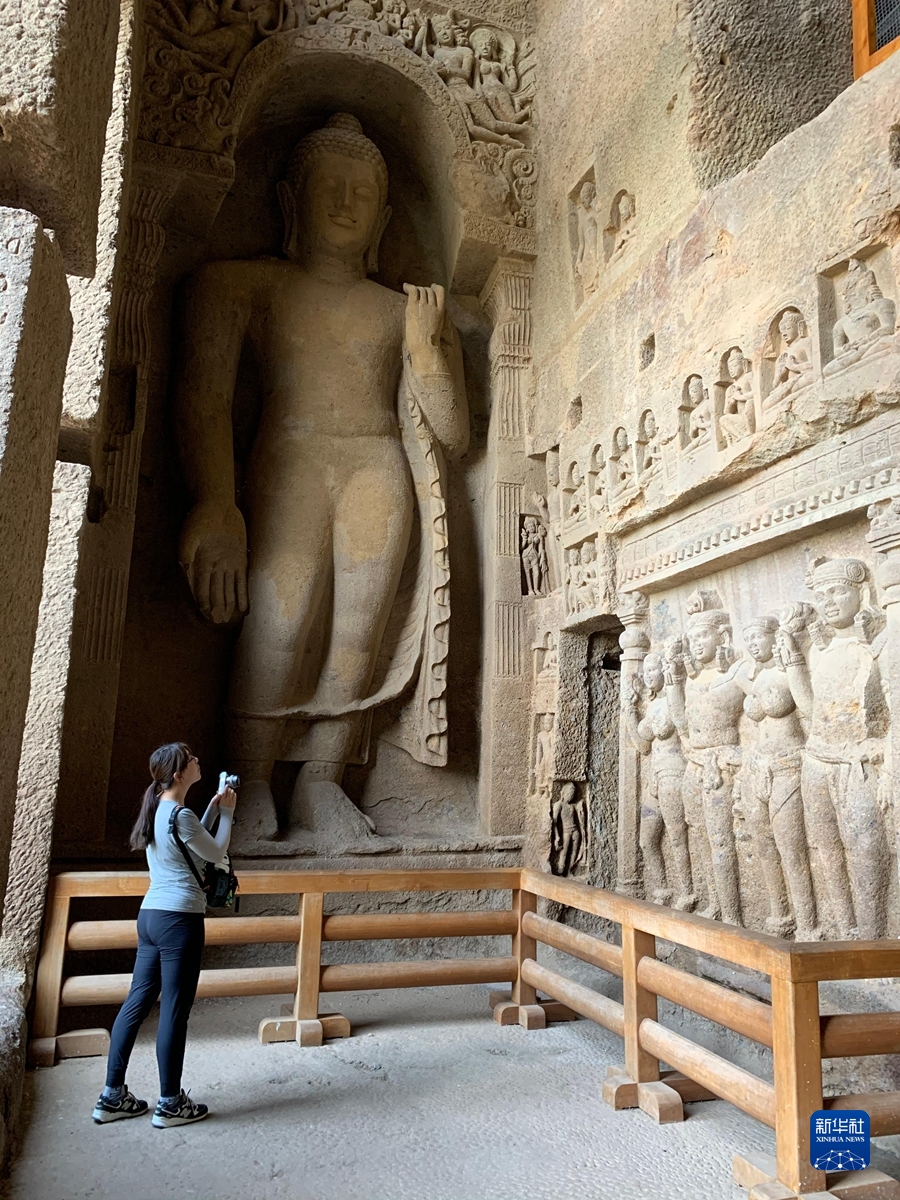 2019年11月,王嬌在印度一石窟記錄圖像資料。新華社發(fā)(受訪者供圖)