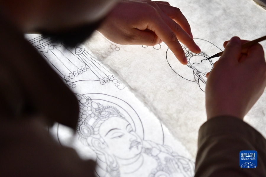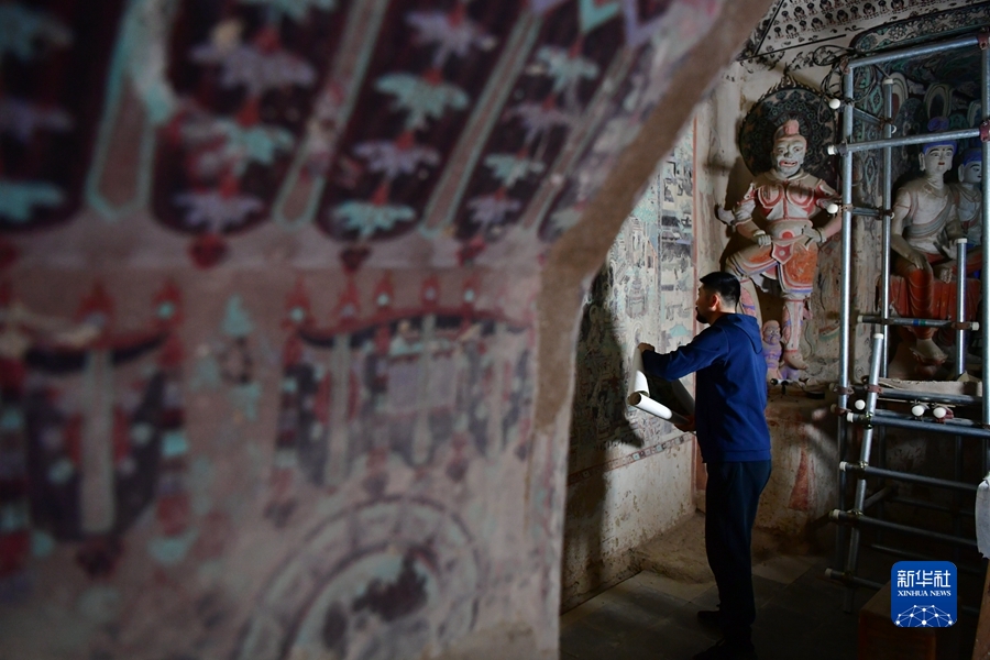 4月19日,在莫高窟第172窟,劉小同在對比臨摹壁畫的細(xì)節(jié)。新華社記者 杜哲宇 攝