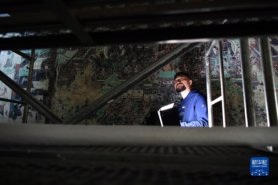 楊金禮今年35歲,他2006年就來到莫高窟,從學(xué)徒做起,逐漸成長為敦煌研究院文物保護(hù)技術(shù)服務(wù)中心的一名壁畫修復(fù)工作者。楊金禮每天都會和同事來到洞窟內(nèi)“面壁修復(fù)”,通過專業(yè)技術(shù)手段解決壁畫產(chǎn)生的起甲、空鼓、酥堿等病害,幫助壁畫對抗時間的流逝。