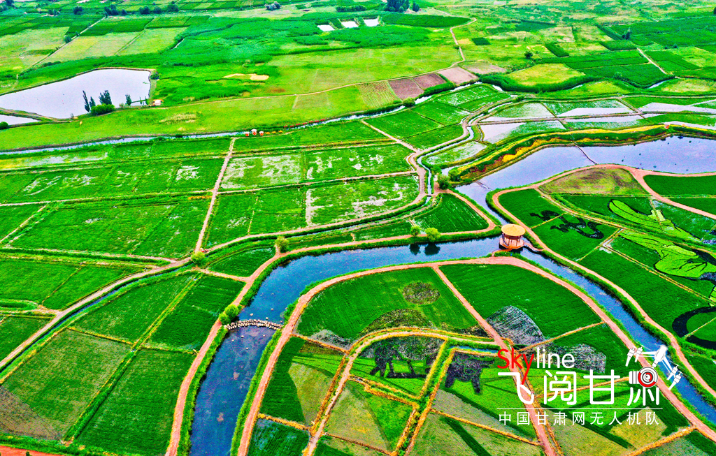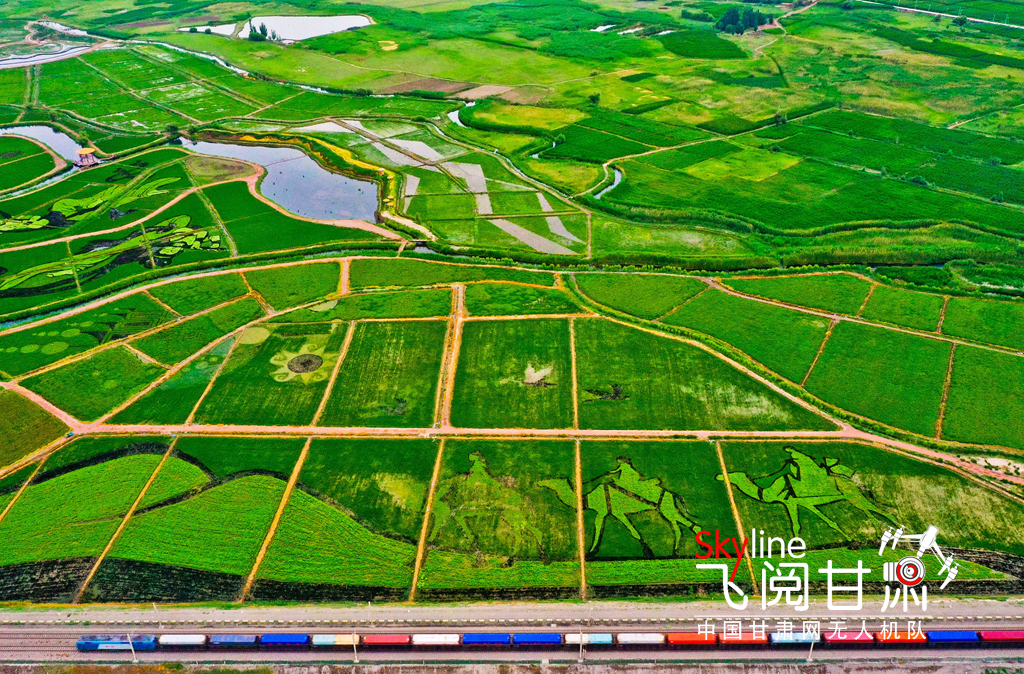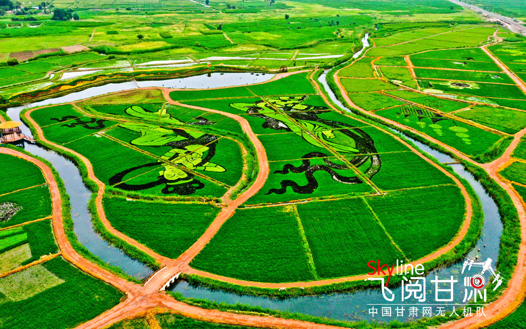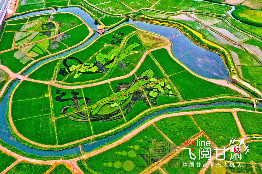 7月13日清晨,一場(chǎng)小雨過(guò)后,張掖市甘州區(qū)烏江鎮(zhèn)新河田園綜合體稻田景觀區(qū)內(nèi)2000多畝稻田塵埃盡洗,一幅幅彩稻畫栩栩如生,從高處俯瞰,田園風(fēng)光和生態(tài)美景展現(xiàn)在人們眼前。