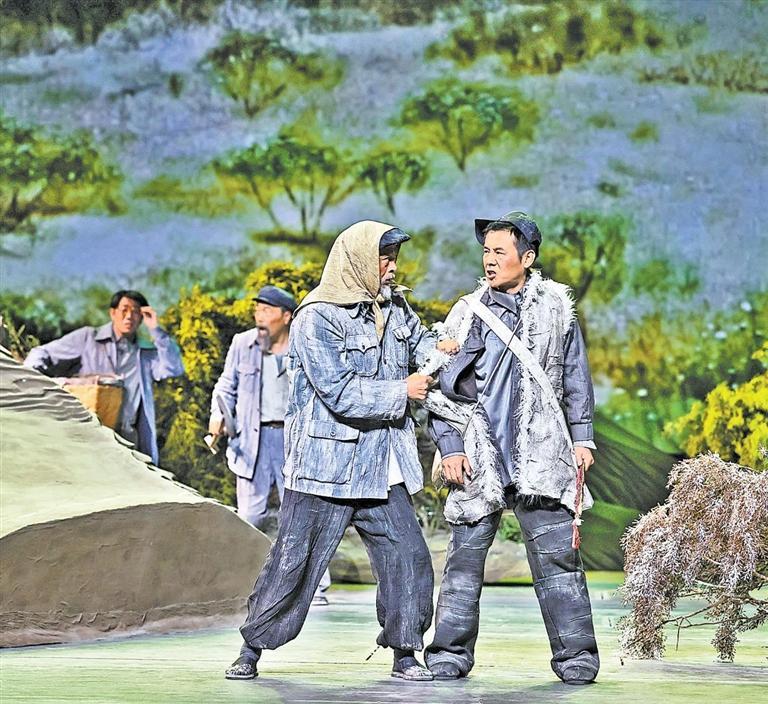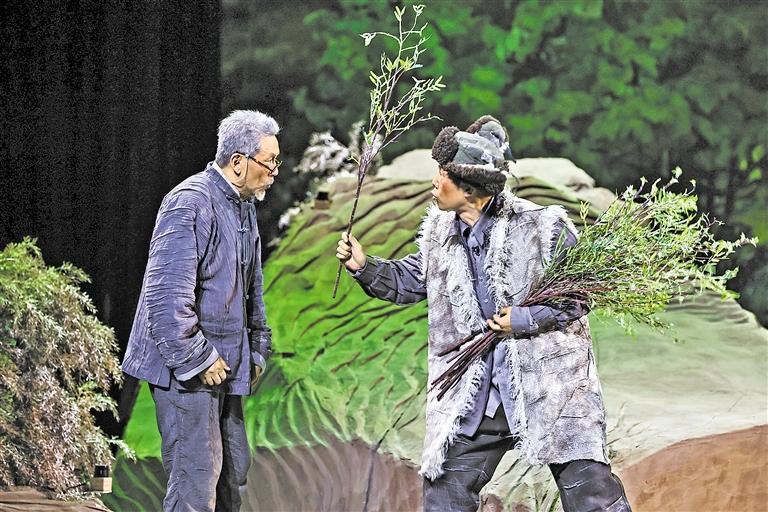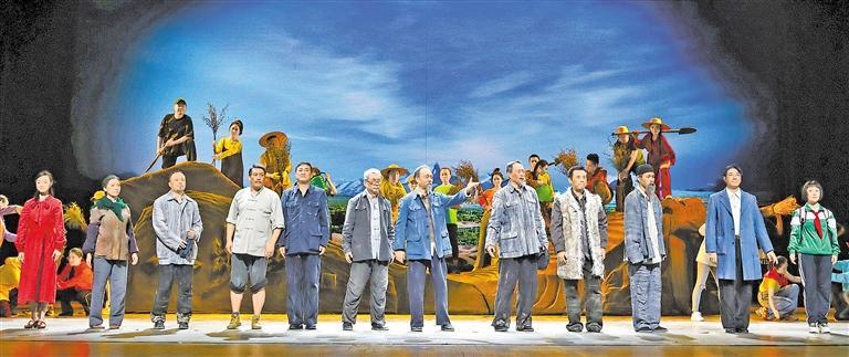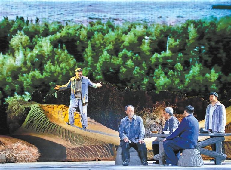現(xiàn)實題材是話劇藝術的寵兒,在話劇進入中國一百多年的時光中,現(xiàn)實題材創(chuàng)作占據(jù)相當大的比例。在近當代中國歷史的進程中,話劇始終起著敢為天下先、針砭時弊的作用,但話劇又有其極其特殊的藝術框范。人們在觀看話劇時,仿佛就是在觀看自己的人生,觀看自己和身邊最熟悉的人們,這是話劇藝術獨具的極高的審美要求。尤其是現(xiàn)代題材的創(chuàng)作,稍有不慎便會陷入同質化的僵硬模式,使舞臺藝術失去應有的美感。話劇《八步沙》讓6個老漢成為舞臺聚光燈下的主角,體現(xiàn)了創(chuàng)作者們呼應時代之需,為最普通的農民寫生立傳的拳拳之心。6個老農民談不上人們通常意識中的“美”,“治沙”這樣的故事也相對比較單調,不大容易出彩,而創(chuàng)作者們以八步沙這個真實的地名作為劇名,以“六老漢”治沙這個真實的事件作為全劇的敘述內容,卻能宕開一筆把特定的外部環(huán)境與人物的內心世界巧妙地融為一體,為全劇注入了濃郁飽滿的戲劇情境和情感,使這部話劇有了獨屬于自己的一份力度、一份無法替代的光彩。全劇的情節(jié)一曲三折,以小見大,當黑壓壓的沙塵暴鋪天而來的時候,當六老漢在嚴酷的環(huán)境中吃盡苦頭,摸索出“一棵樹,一把草,壓住沙子防風掏”的寶貴經(jīng)驗,使漫無邊際的沙漠終于出現(xiàn)一抹綠色,繼而眼看著一棵又一棵綠樹成活成林,終于成為一片綠洲的時候,我相信觀眾的心也被藝術琴弦撥動,始終被劇情牽著走,為劇中人物的命運擔心、懸心、痛心、開心,從中深深地感受到劇中所蘊藏的豐富內涵和它所傳達出的真切意趣。