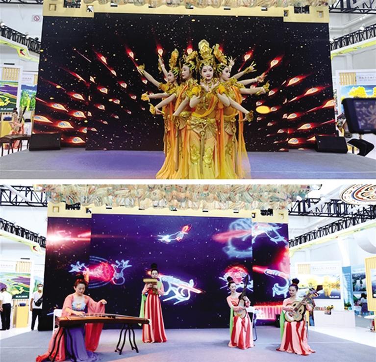 甘肅展區(qū)舞臺(tái)上,身著古裝的演員們生動(dòng)演繹著《千佛》《散花飛天》《反彈琵琶長(zhǎng)綢舞》等極具甘肅特色的敦煌古樂和敦煌舞蹈,令游人流連忘返。
