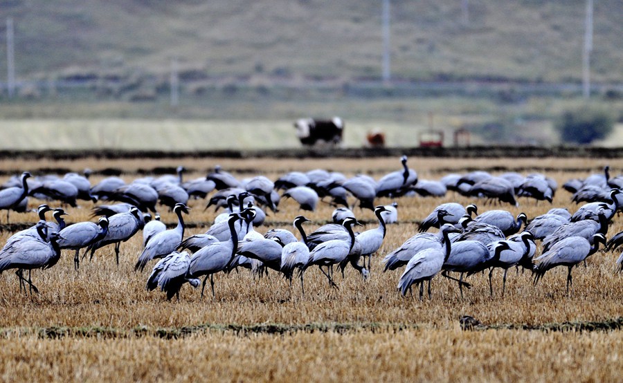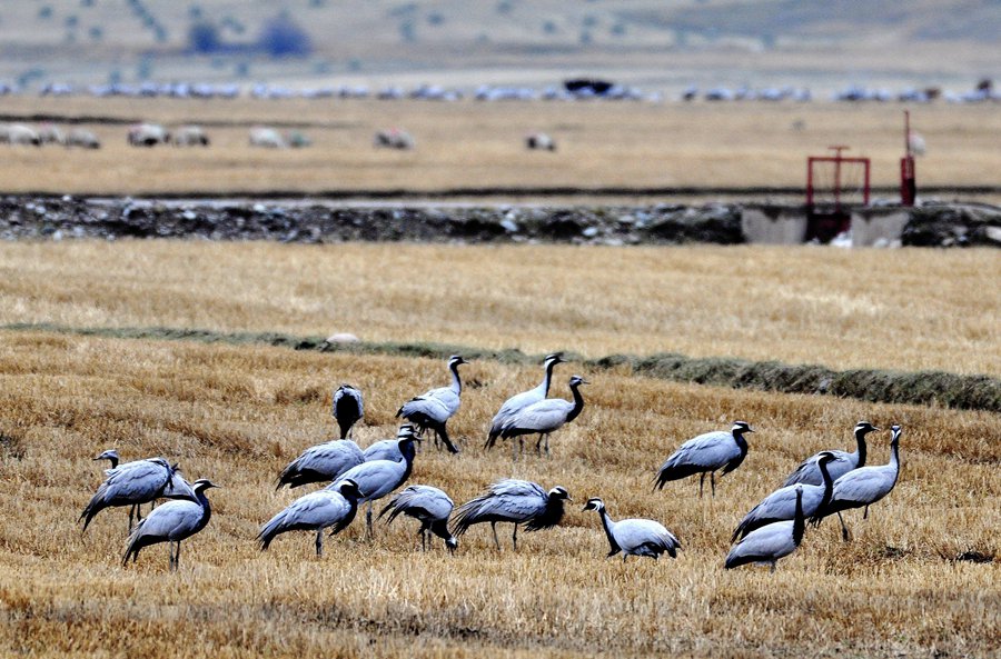 人民網(wǎng)蘭州10月10日電 (記者高翔)寒露至、候鳥遷,甘肅省肅南裕固族自治縣皇城鎮(zhèn)夏日塔拉草原迎來數(shù)千只蓑羽鶴,它們?cè)跐竦氐乃嫔?、草叢中或悠閑覓食、或蹁躚起舞,與色彩斑斕的草原構(gòu)成了一幅和諧優(yōu)美的生態(tài)畫卷。