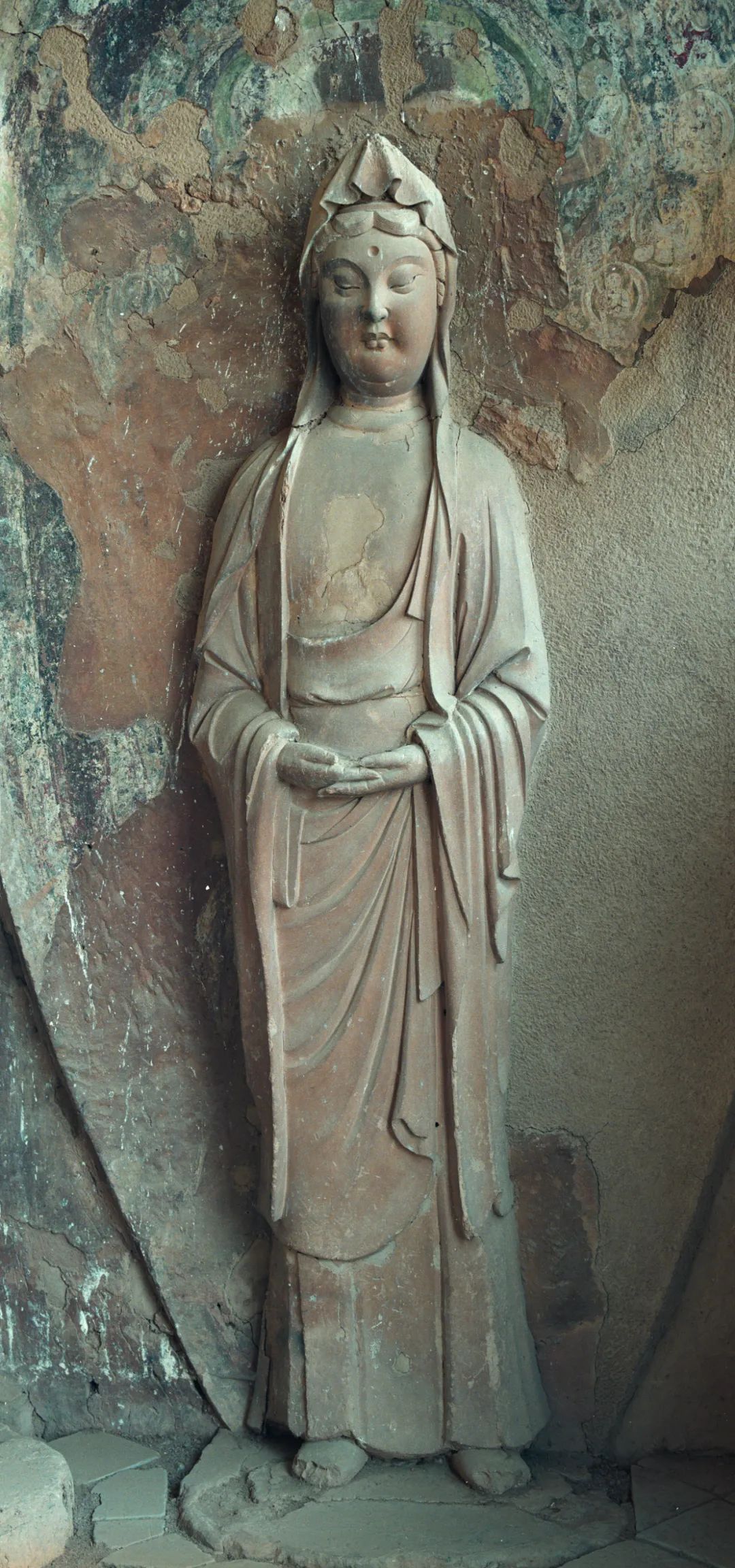 從題材上看,以單尊佛、菩薩、力士等為主,風(fēng)格上更具有寫實性。造像面相橢圓飽滿,斜眉吊目,懸鼻小口,表情森嚴(yán)、凝重,服飾簡潔、質(zhì)樸,寬博厚重,極富質(zhì)感。其中佛低平螺髻,前置肉髻珠,身穿垂領(lǐng)袈裟。菩薩束發(fā)高髻或戴風(fēng)帽,眉目慈祥,身材比例協(xié)調(diào)、準(zhǔn)確。力士表情生動傳神,體形孔武雄健,充滿陽剛之氣,給人以強(qiáng)烈的力量和威武感;這段時間造像前衰后盛也與當(dāng)時秦州所處環(huán)境有密切關(guān)系。
