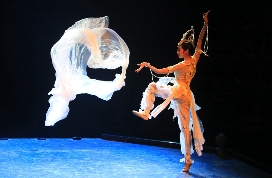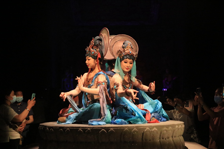 大型洞窟式沉浸體驗(yàn)劇《樂動敦煌》演出現(xiàn)場。張曉亮攝