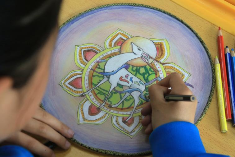 敦煌市西關(guān)小學(xué)美術(shù)社團(tuán)的學(xué)生正在為帶有敦煌壁畫(huà)元素的團(tuán)扇畫(huà)圖上色。張曉亮 攝