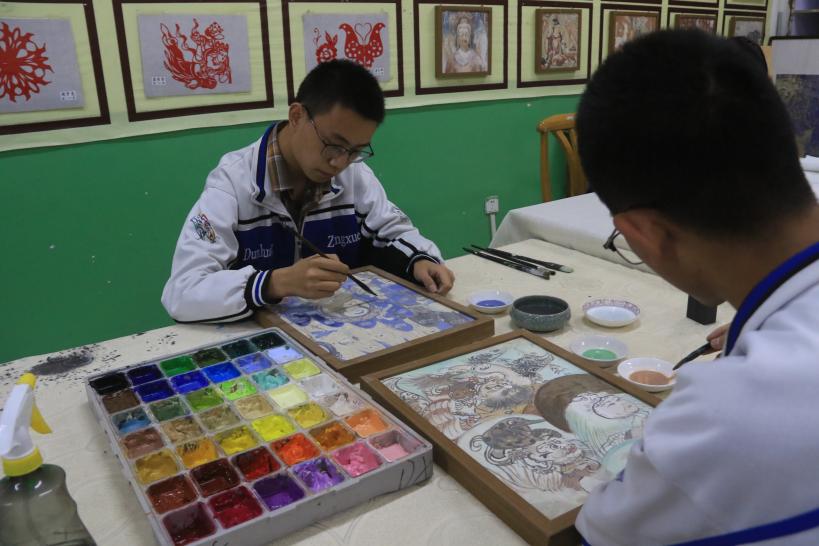 敦煌中學(xué)的學(xué)生在學(xué)校畫(huà)室里臨摹敦煌壁畫(huà)。張曉亮 攝