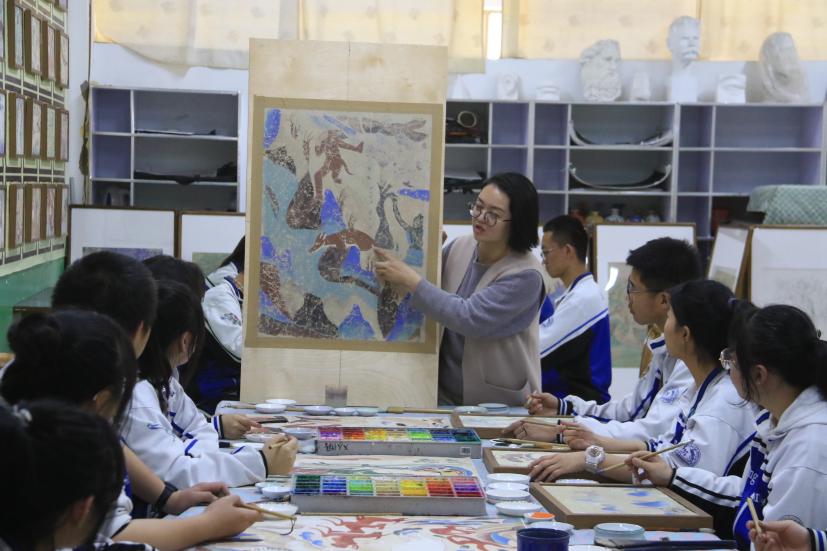 敦煌中學(xué)美術(shù)教師楊娜為學(xué)生講解敦煌壁畫(huà)藝術(shù)。張曉亮 攝