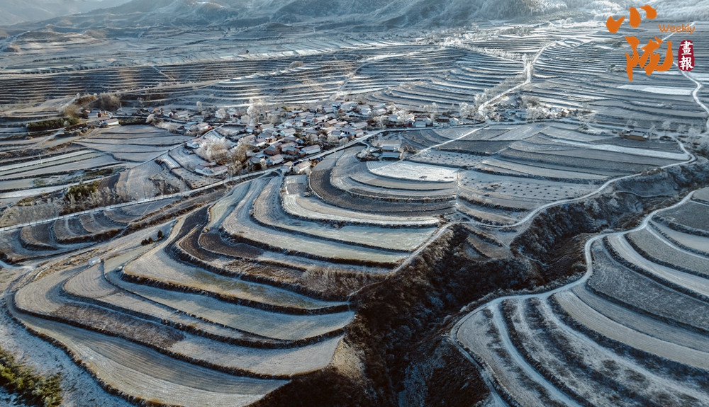 雪落千層入畫(huà)來(lái)。雪后初晴,被冬雪覆蓋的梯田,銀裝素裹,如大自然的素描,錯(cuò)落有致的線條,慢慢鋪展出一幅山村美景。