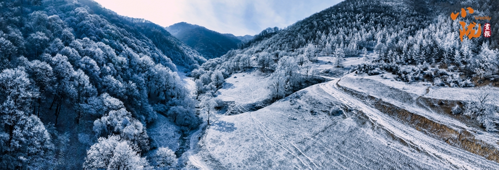 關(guān)山被白雪覆蓋,滿(mǎn)山樹(shù)木掛滿(mǎn)了晶瑩的雪花,好像穿上了潔白的婚紗,格外美麗。