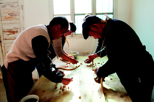 七十二行,釀酒、熬糖最繁瑣。香甜的麥芽糖,如同世間的其他事物一樣,都是通過勞苦換來的,正所謂苦盡甘來。田新民做灶糖用的是麥芽糖,首先要將原料小麥浸泡生芽,然后生成麥芽,不過有了麥芽,還要經(jīng)過多道工序才能變成麥芽糖。通常泡發(fā)麥芽之后,接下來就是蒸制配料,要依次進(jìn)行碾米、浸泡籠蒸、擠糖汁、二次籠蒸,再用力將麥芽搗碎,拌入蒸熟的黃米裝缸,加開水浸泡,淋出第一遍糖汁,再加開水淋出第二遍糖汁。然后再把兩次淋出的糖汁,倒至鐵鍋內(nèi)加小火,用木锨或木棒攪動,使水分蒸發(fā)凝結(jié)成固體,最終即得麥芽糖。熬糖要反復(fù)三次,經(jīng)過六個小時(shí)才能成功。田新民說:“這樣熬出來的糖,密封好后,埋在地下很多年都不會壞。”