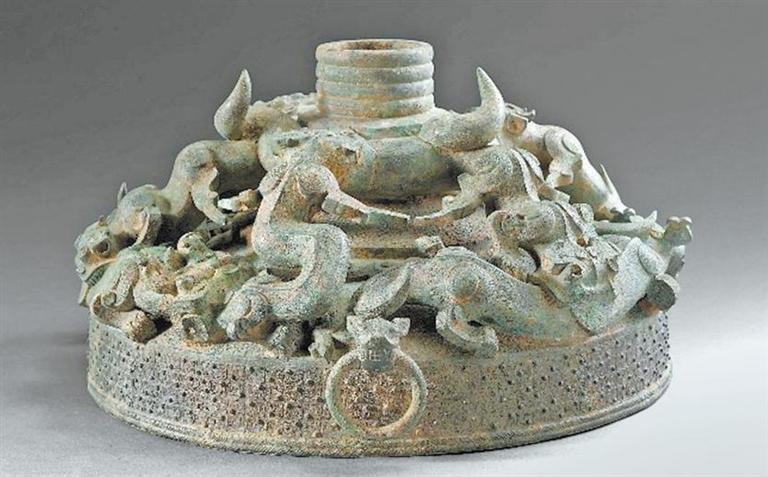 上海博物館收藏的鏤空蟠龍紋鼓座,高30厘米,重37.9千克,在半球體的鼓座面上,分別攀爬有12條大小不一、相互噬咬的圓雕蟠龍。其中三條龍的龍首和龍身朝下,龍尾盤繞于插鼓柱的圓筒周邊,龍口咬住圈足上攀爬之龍的龍身;三條龍的龍首和龍身彎曲朝上,龍尾盤繞于圈足之上,龍口咬住朝下之龍的尾部;三條龍繞鼓座一周攀爬于圈足上部,龍口咬住朝上之龍的龍尾。在其翹起的龍尾下分置有三條小龍,小龍的龍首作圓雕形,口銜圓環(huán),龍體則以高浮雕的形式置于鼓座面上。大龍雙目圓形中空,可能原有鑲嵌物,現(xiàn)已遺失。龍角的兩端為空槽,可能也曾有類似的裝飾物。在鼓座基座的立面上,還刻有眾多蟠龍紋。