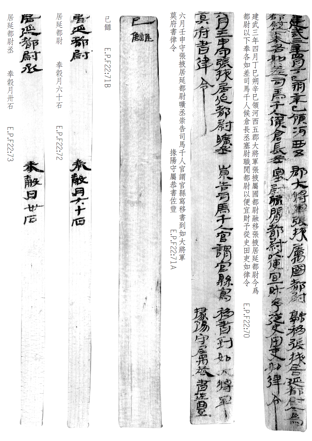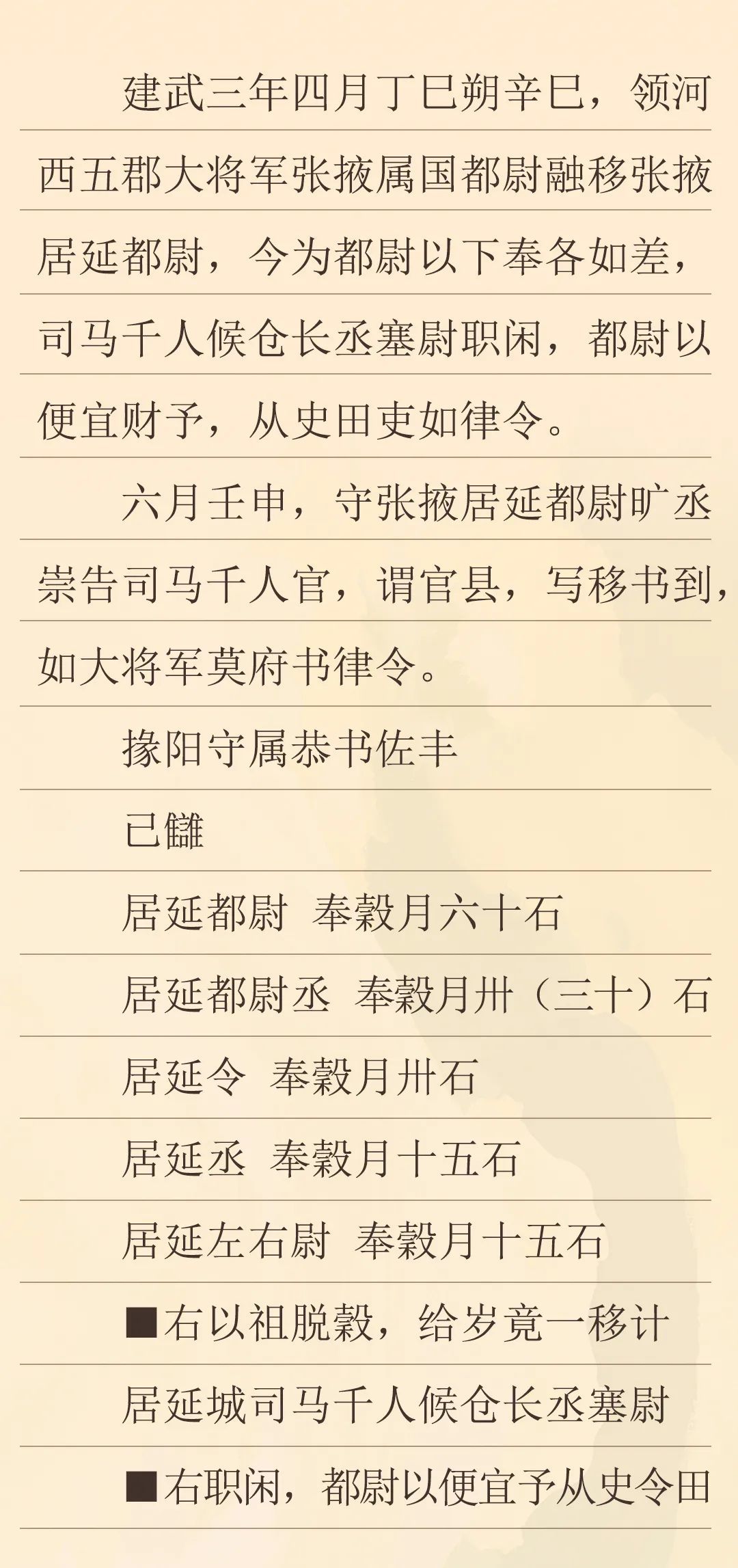 這封冊書記載了建武三年,竇融管轄河西時發(fā)布的一條關于都尉以下官吏奉谷等差的命令。根據竇融發(fā)布的新規(guī)定,我們可以看到,秩比二千石的居延都尉月奉谷僅為六十石,史書有“十斗一斛”及“十斗一石”的記載,此六十石即是六十斛,相比于史書記載中比二千石每月百斛的俸例要少,而其余官吏的俸祿也相應要少,雖然漢代不同時期的官吏俸祿存在變化,但對比所見的這種情況,可能也跟兩漢之交戰(zhàn)亂頻仍的社會環(huán)境有重要關系。