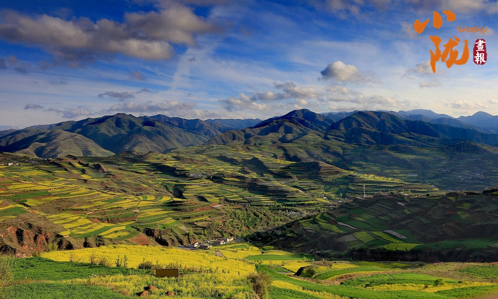 遠(yuǎn)處黃綠交錯的油菜花,在藍(lán)天白云襯托下艷麗多彩,起伏的山巒上黃色顯得尤為斑斕,這里是眾多畫家、藝術(shù)家的創(chuàng)作天堂。