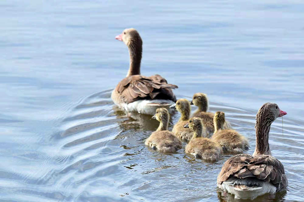 灰雁是鴨科雁屬鳥類,屬國家重點保護(hù)的“三有”鳥類,也是陽關(guān)濕地的夏候鳥。監(jiān)測顯示,在陽關(guān)濕地繁殖的灰雁家族有100多只。每年3月下旬遷飛至陽關(guān)濕地,4月中旬筑巢繁殖,5月上旬孵化出雛鳥4至5只?;已銥?ldquo;一夫一妻”制,孵化由雌鳥單獨承擔(dān),雄鳥在巢附近負(fù)責(zé)警戒。待雛鳥破殼出窩后,則由雌雄共同撫育。灰雁生性膽小、機(jī)警,小寶寶溜達(dá)時,雌鳥在前開道,雄鳥負(fù)責(zé)斷后,小寶寶上岸覓食嫩草芽時,雄鳥仍然負(fù)責(zé)警戒,若有危險立刻鳴叫警示。故而,近距離拍攝灰雁雛鳥是比較困難的。