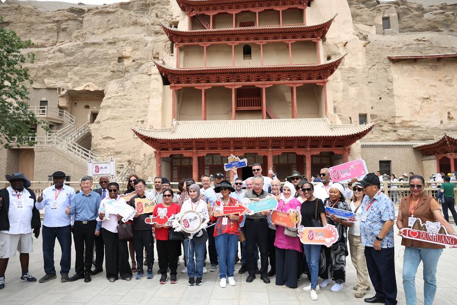 6月6日至8日,來自22個(gè)國家的駐華使節(jié)和高級(jí)別外交官走進(jìn)敦煌,尋訪莫高窟,游覽鳴沙山月牙泉景區(qū),參加河西走廊五市的文旅專場推介會(huì),并在對(duì)話會(huì)上共同探討“絲路精神推動(dòng)文明交流互鑒”。