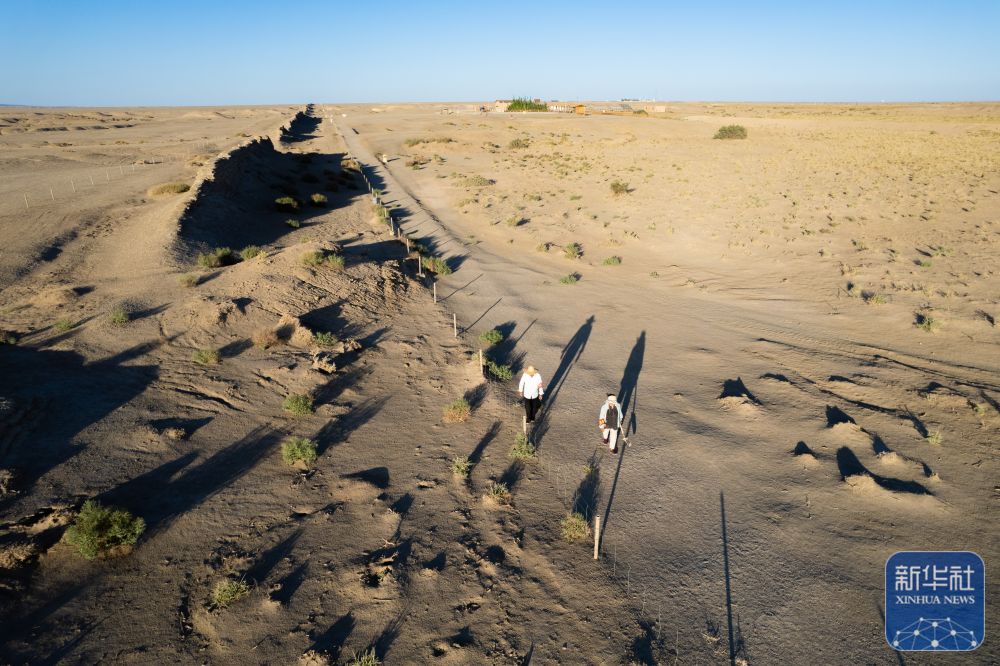 ↑7月16日,張吉全和聞春瑜夫婦沿著漢長城巡護(無人機照片)。