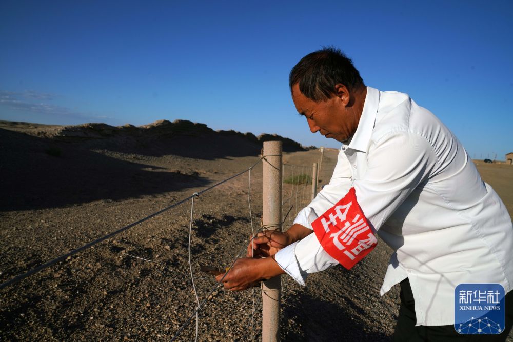 ↑7月16日,張吉全和聞春瑜夫婦沿著漢長城巡護時加固防護欄。