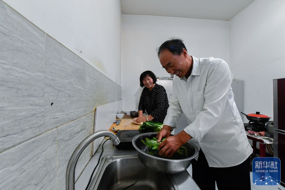 ↑7月16日,張吉全和聞春瑜在廚房洗菜和面準備做飯。