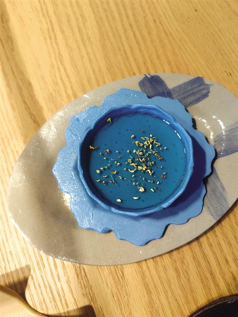 拿起一塊甜品,省博物館的鎮(zhèn)館之寶之一——“琉云璃彩”藍(lán)蓮盞近在眼前,“冰肌玉骨”的七瓣之蓮,顏色高貴的蓮花形托盞,果凍狀甜品上桂花飄香。你肯定想不到,這是一款通體可食的低糖蛋糕,它像夜幕下一朵綻放的藍(lán)蓮花,以奶油為原材料。在這里,顧客是可以“吃文物”的。