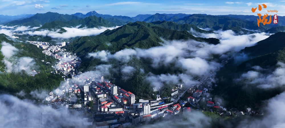 放眼望去,云海宛如輕紗,在山峰間奔涌,將群峰、民居、綠樹籠罩,猶如世外桃源。