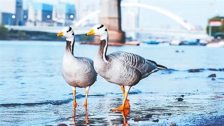 蘭州市中山橋附近的兩只斑頭雁。(王彬彬供圖)