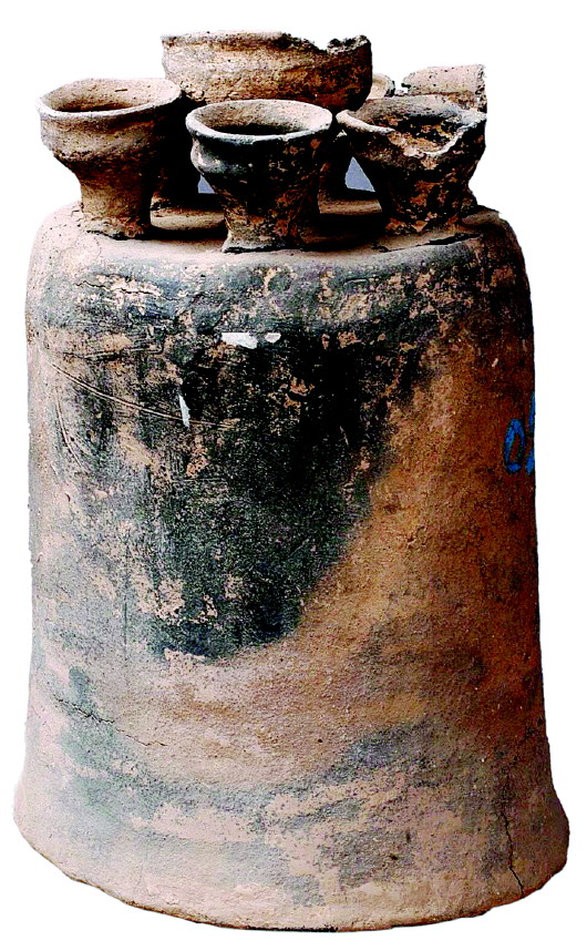 寺洼文化灰陶聯(lián)盞,通身為泥質(zhì)灰陶,主體呈一倒扣的鐘形,在鐘形體的頂端粘連著七個豆狀盞杯。其中中間一個稍大略高,其他六個稍小一些,等距分布在中央一個的周圍,呈眾星拱月之狀。