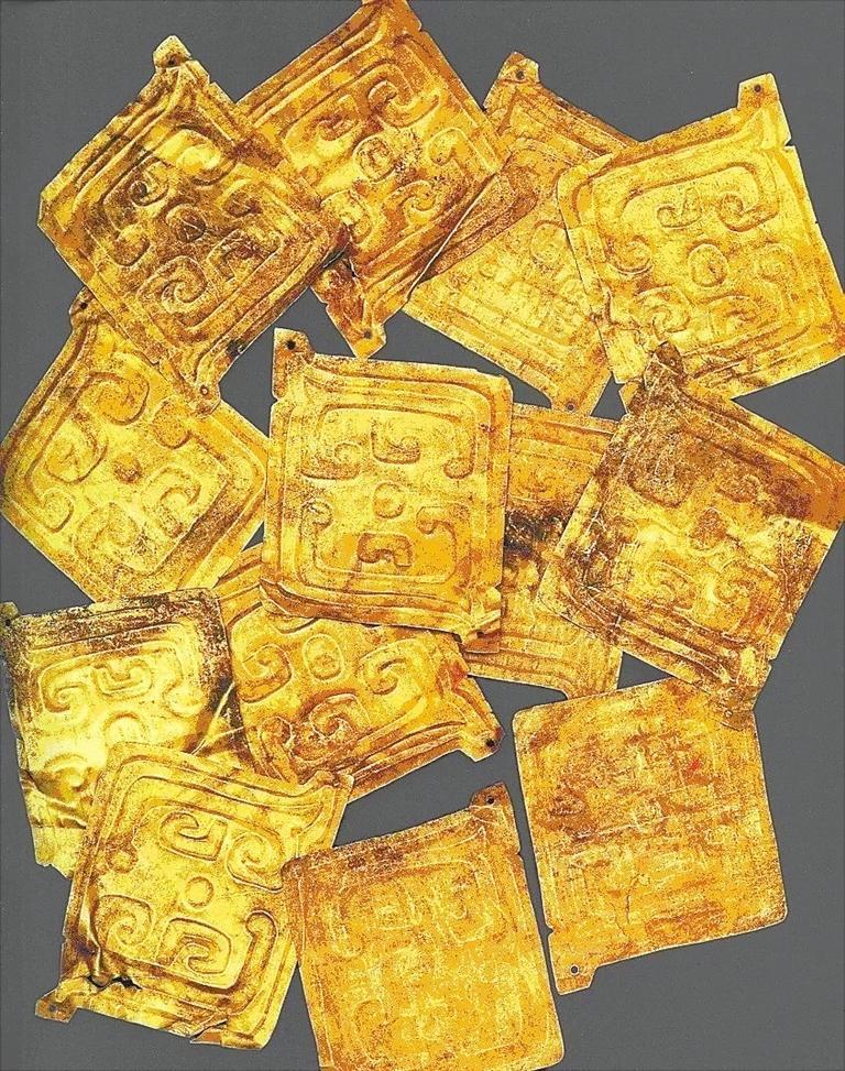 1994年春,陜西省考古研究所所長(zhǎng)韓偉在法國(guó)、比利時(shí)訪問(wèn)期間,見到了一批從香港過(guò)來(lái)的金飾片和一對(duì)金虎。韓偉先生對(duì)這組金飾片從器形、紋飾進(jìn)行了分析,并參考蘇黎世研究員莫爾夫人從金虎內(nèi)提取的木制標(biāo)本碳-14檢測(cè)結(jié)果,認(rèn)為這批金飾片為西周晚期秦人首領(lǐng)秦仲或秦莊公墓棺上的裝飾物。