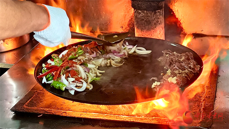 如今,炒撥拉已經(jīng)成為山丹人日常生活中不可或缺的一部分。在焉支巷子,游客可以看到多家炒撥拉店,每家店都有其獨特的炒制技藝和風味。店家將切好的羊肝、肺、肚、腸、心等佐以洋蔥、青椒下入一個鑄鐵鏊子里,再加上幾勺鹽和辣椒面,開始用猛火爆炒?;鹦撬臑R,一頓撥拉之后,待到七分熟左右再放入提前準備好的白餅塊一起翻炒即可。不一會兒,一鍋美味可口、熱熱乎乎的炒撥拉就制作完成了。